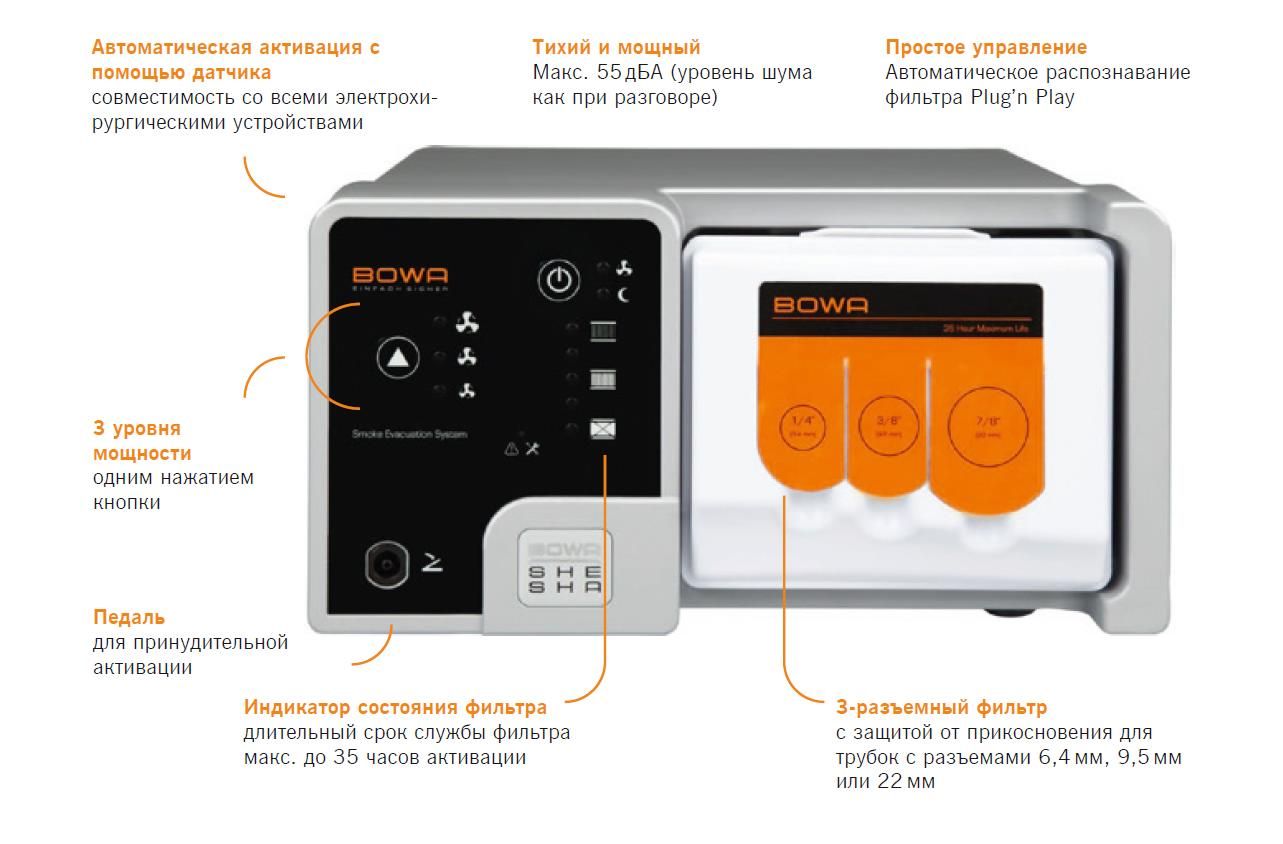 Система дымоудаления SHE SHA обеспечивает хирургу четкий обзор операционного поля, что повышает точность вмешательства и сокращает его длительность. Она совместима с электрохирургическими аппаратами BOWA ARC (модели 100, 250, 303, 350, 400) и модулем для аргоноплазменной коагуляции ARC PLUS.